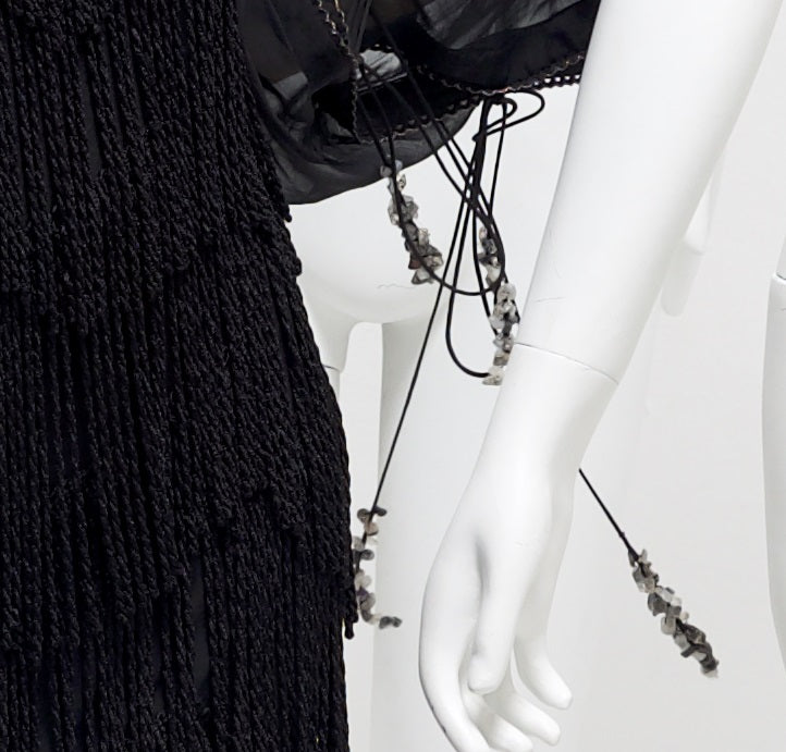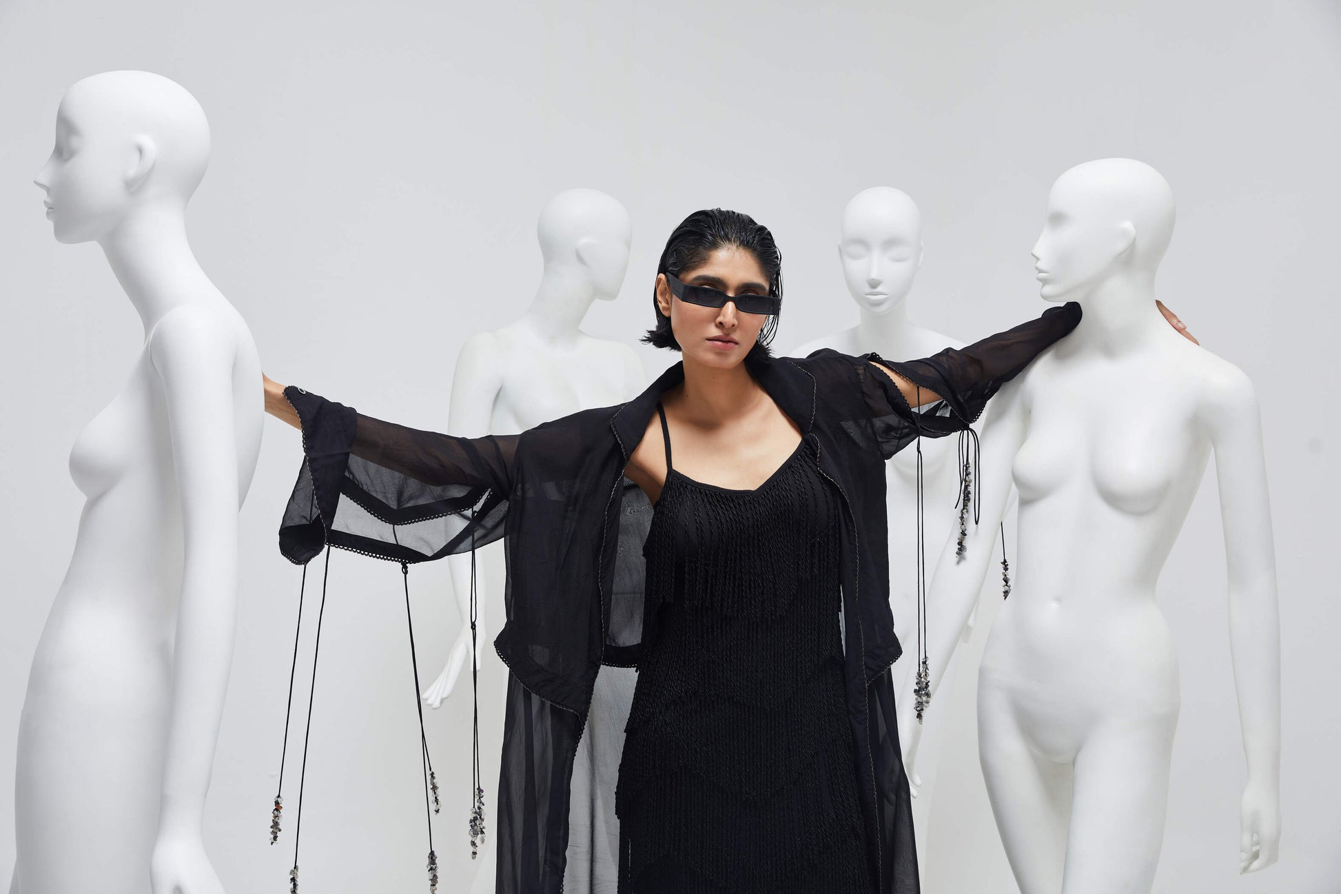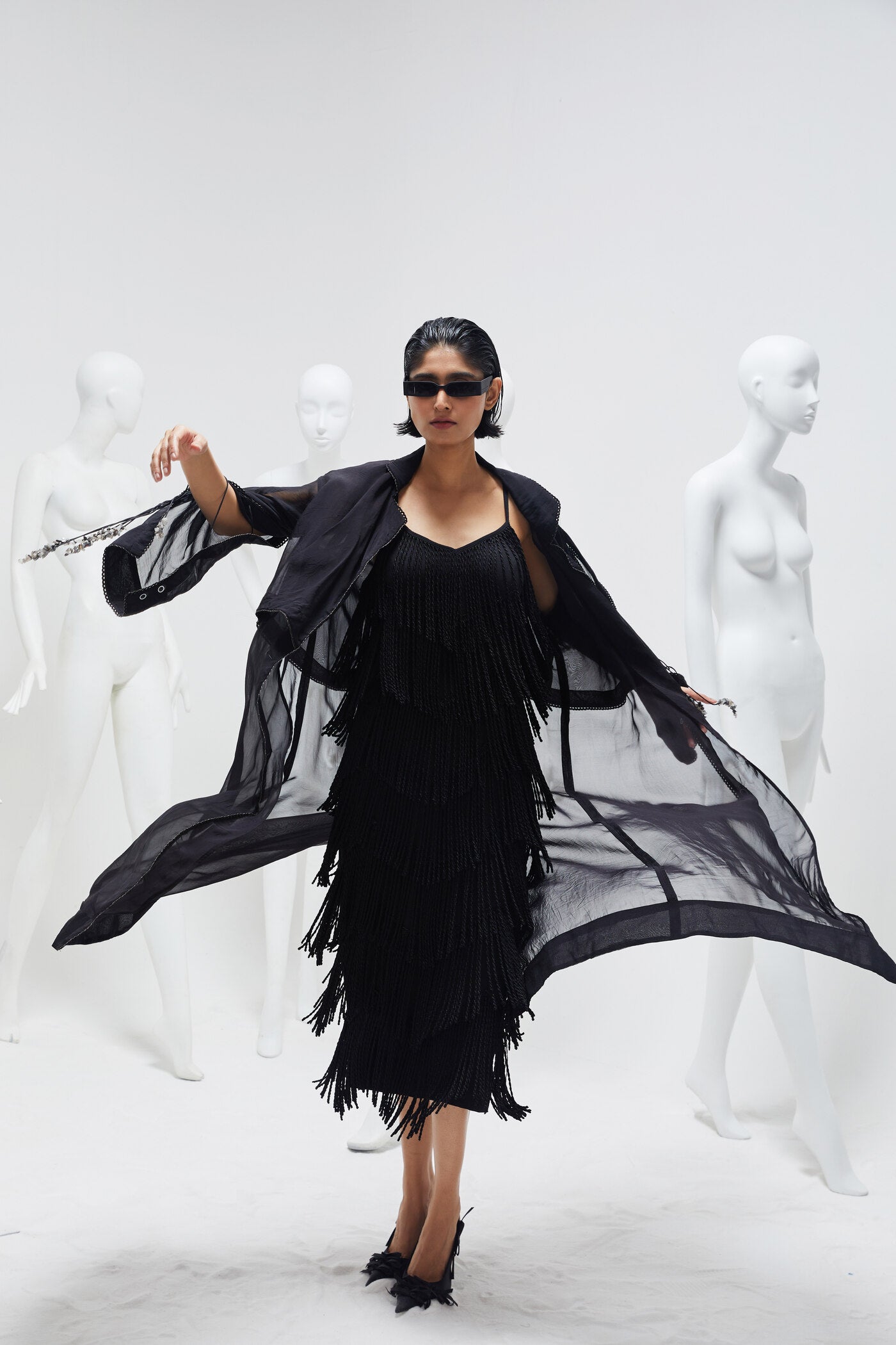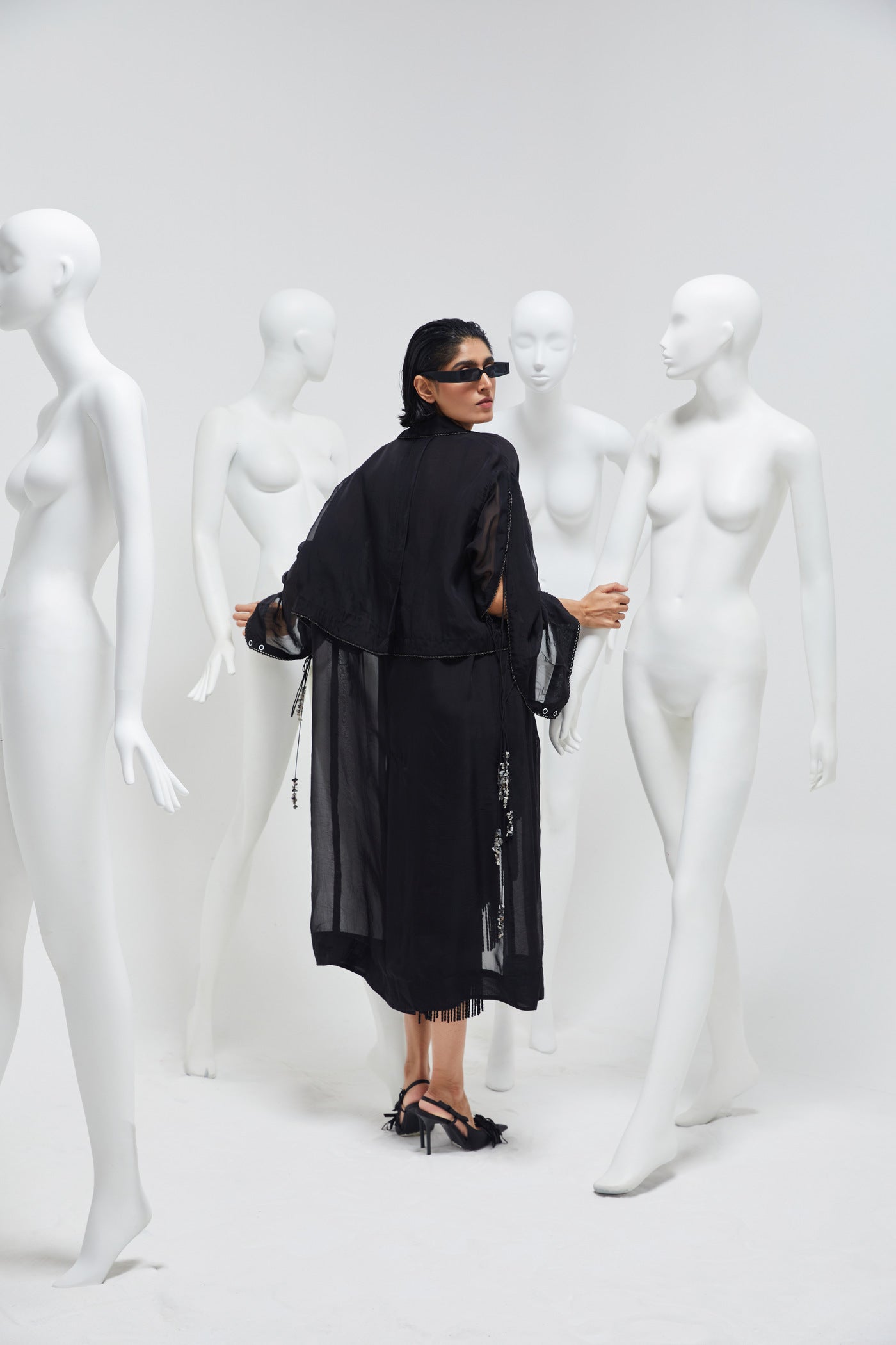 Never seen elegance go out of style with our KOA Sheer Trench coat, made in the fabric organza with flirtatious drawstrings enhanced with black-white ceramic beads, fastens with buttons at the front and sleeve.