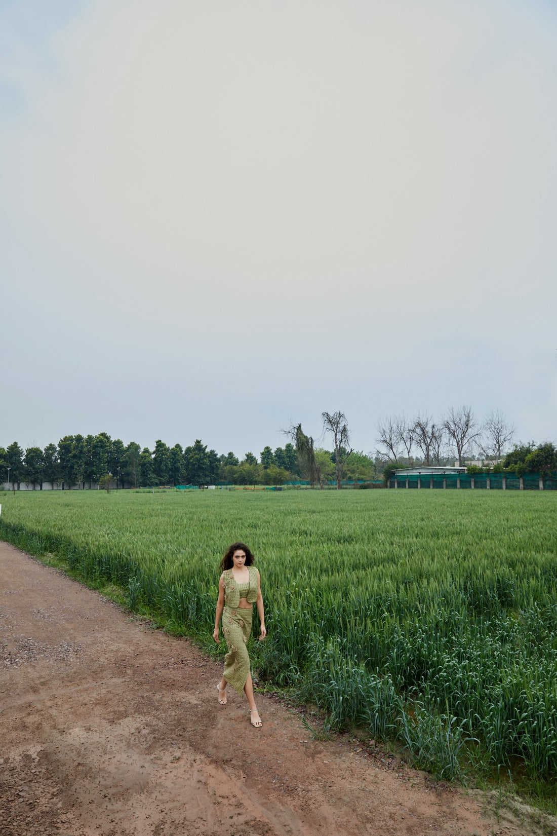 Product Name : CRUNK LUSH GREEN JUTE SURFACING VEST WITH SKIRT CO-ORD (VEST, BUSTIER AND...