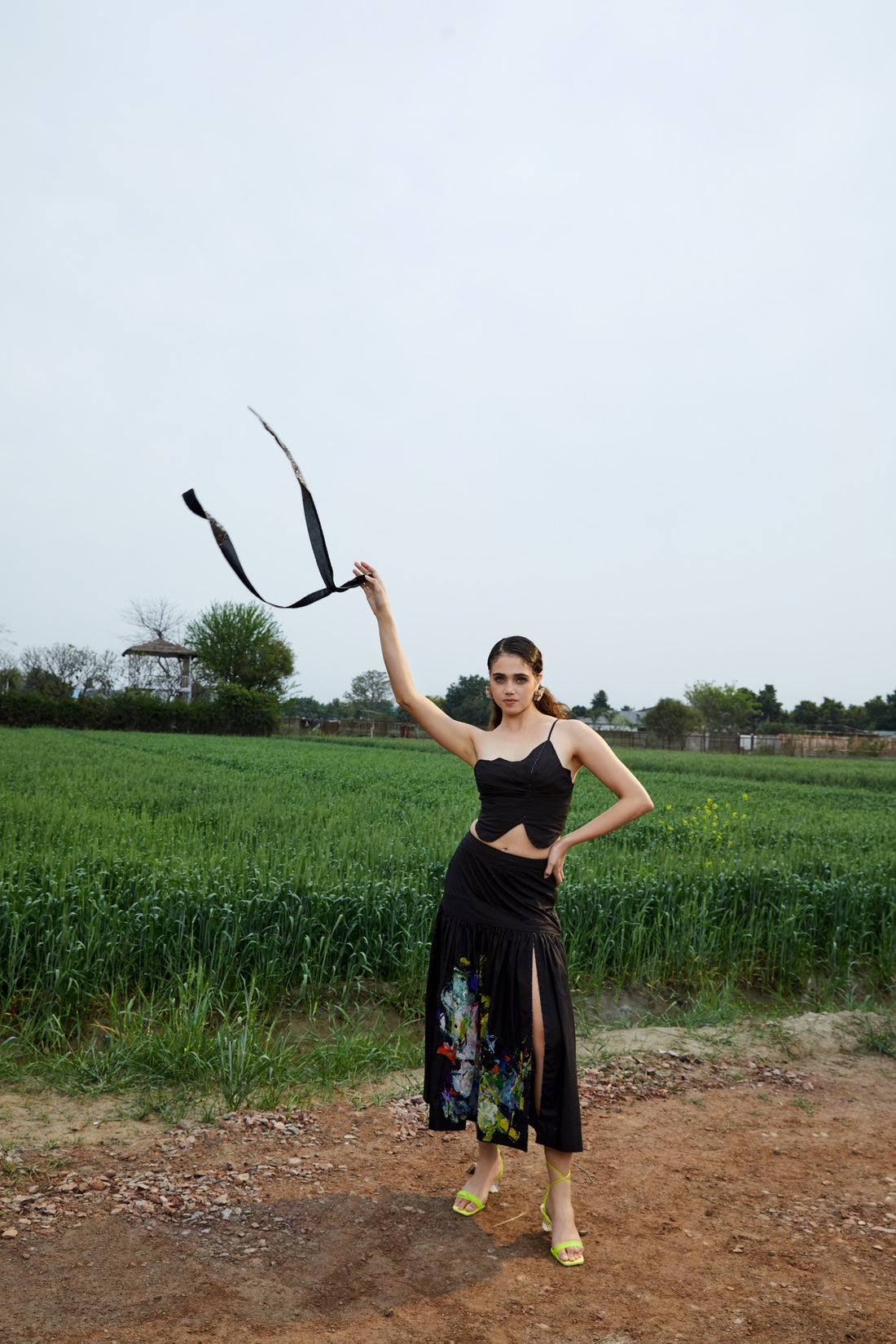 CRUNK BLACK EMBROIDERED FLORAL CO-ORD (CROP TOP AND SKIRT)