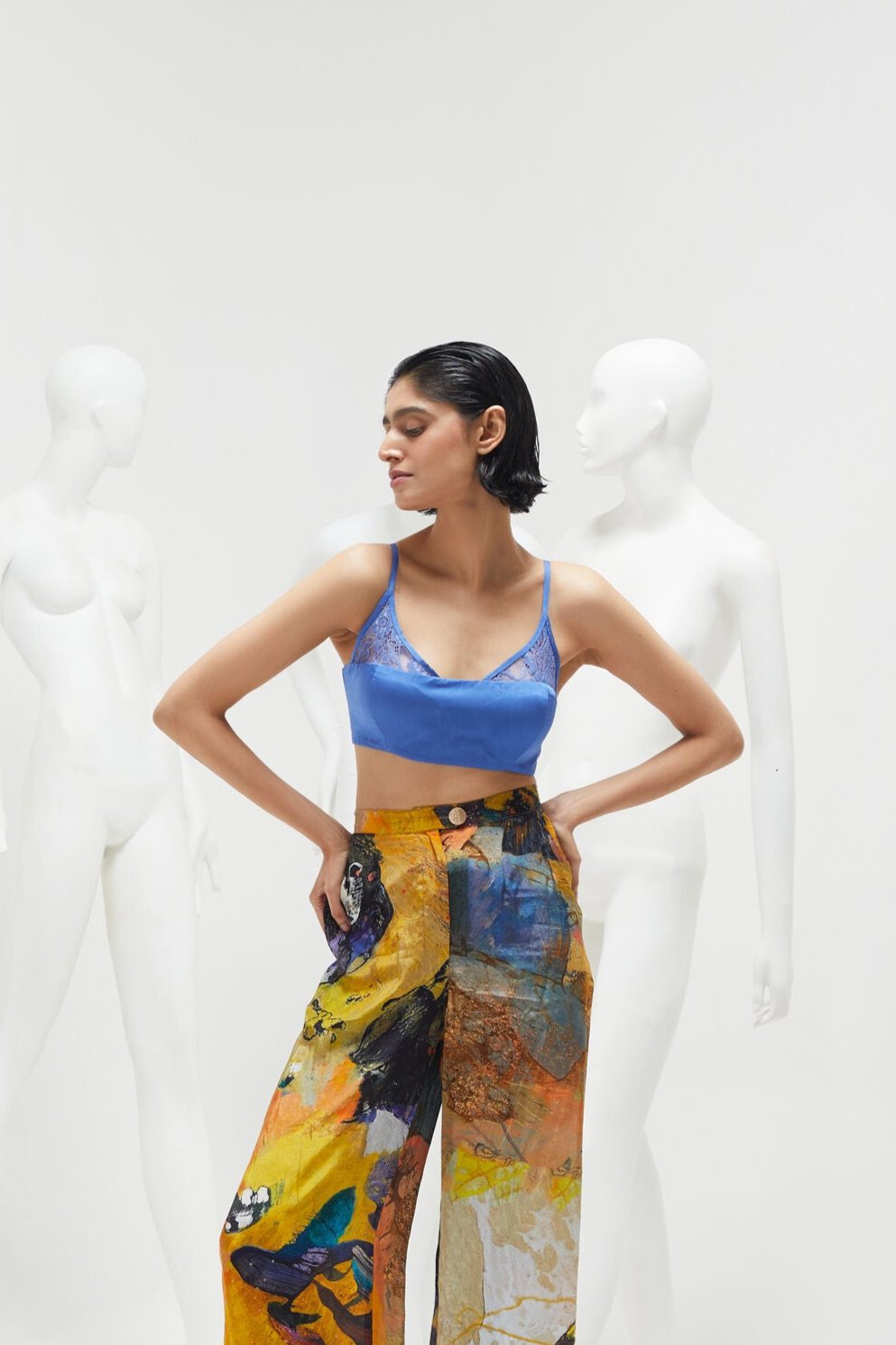 Product Name: CRUNK METALLIC BLUE ORGANZA PANTS Product Description: Summer gets a bold floral update...