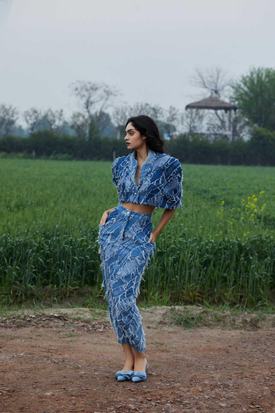 CRUNK LIGHT BLUE WASH FRINGED DENIM STRUCTURED SKIRT