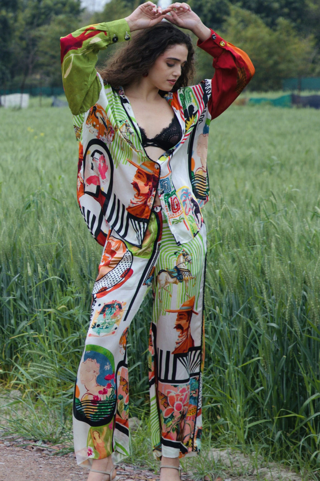 CRUNK VARICOLORED PAINTING PRINTED EMBELLISHED CO-ORD (SHIRT AND PANTS)