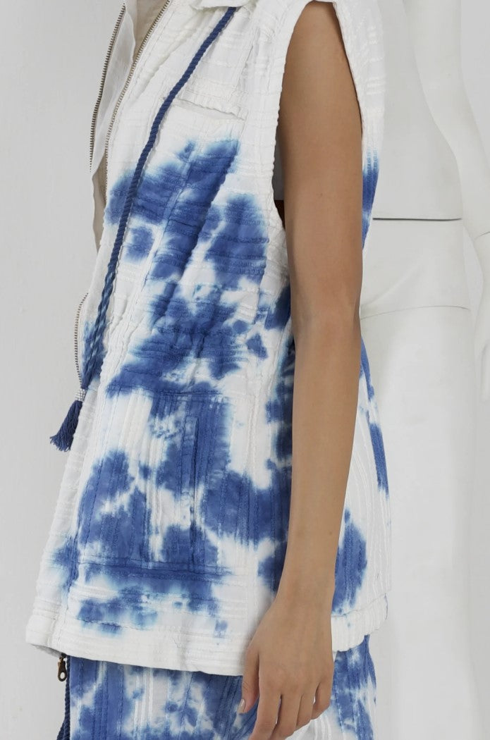 AERY Co-ord with, a utility jacket, made in cotton gauze weave fabric enhanced with the handcrafted placement of blue, and white tie dye onto it, with four drawstrings to cinch your waist and adjust the neck along with four utility pockets to prioritize your needs. A silhouette made with an opening in front with a metal zipper and hood at the back, tapered pants are a must-have, the fit is so body tapering crafted with cotton weave gauze fabric. The front button placket is adorned with exclusive buttons and has inseam side pockets. The style is enhanced with the handcrafted placement blue, white tie dye done with perfection and, an adorable white breezy poplin AERY bralette constructed with Crisscross straps on the shoulder adding romance to the outfit along with a zipper closure at the back. Designed to flatter and flex.
