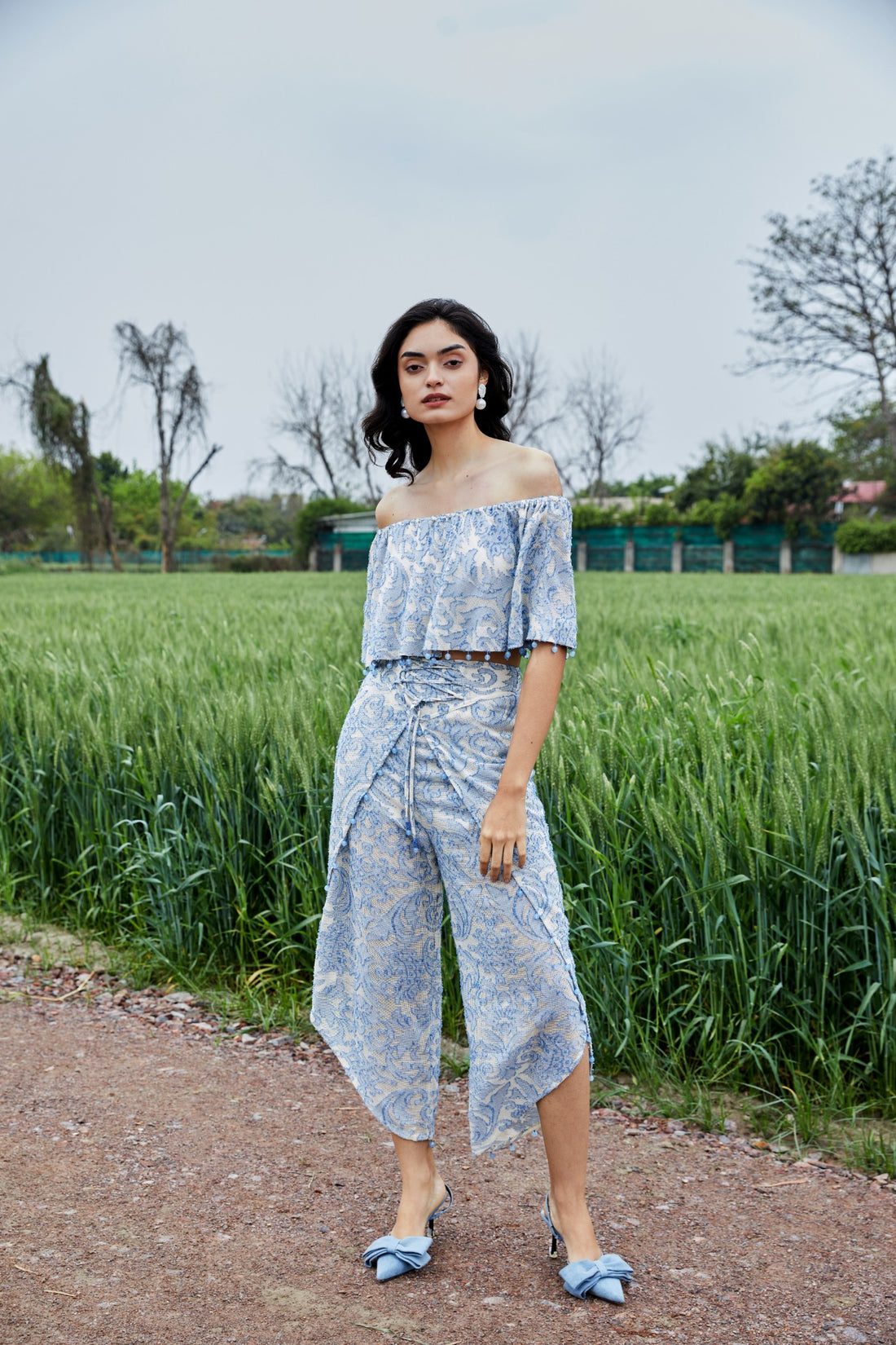 Product Name: CRUNK MISTY BLUE SELF SHEER JACQUARD OFFSHOULDER TOP Product Description: A piece of...
