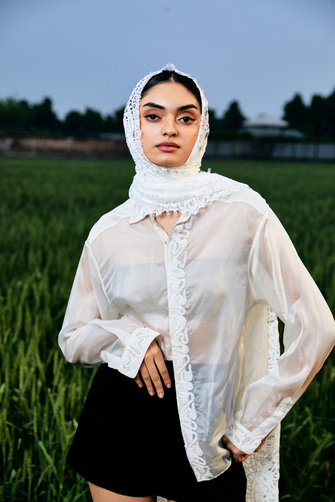 CRUNK OFF WHITE SHEER EMBELLISHED SHIRT