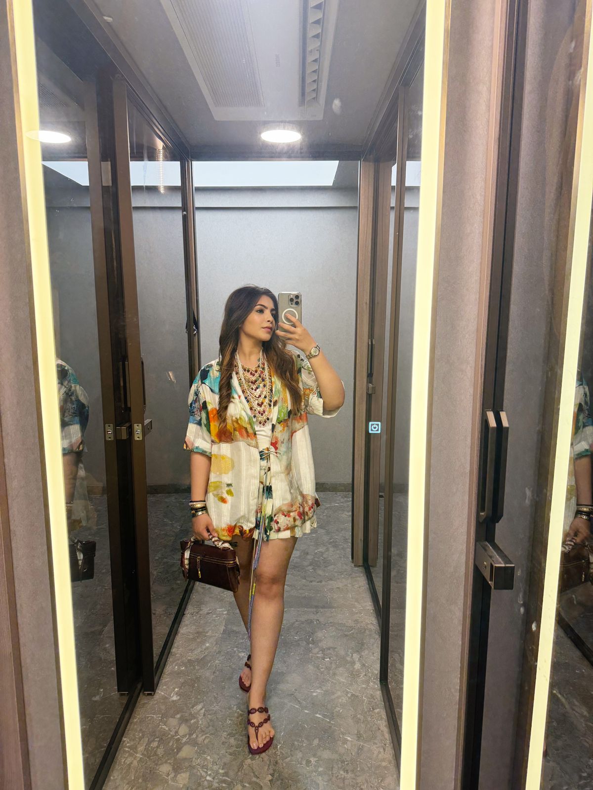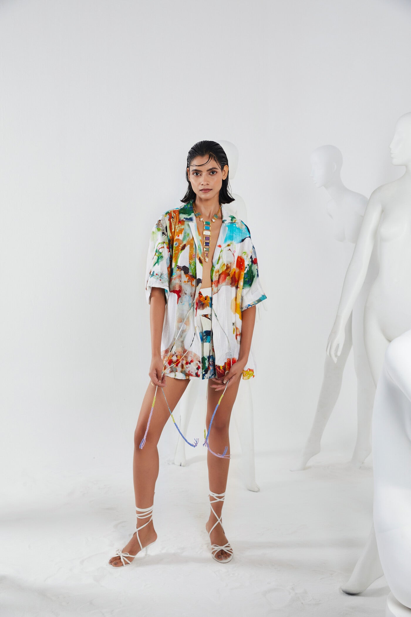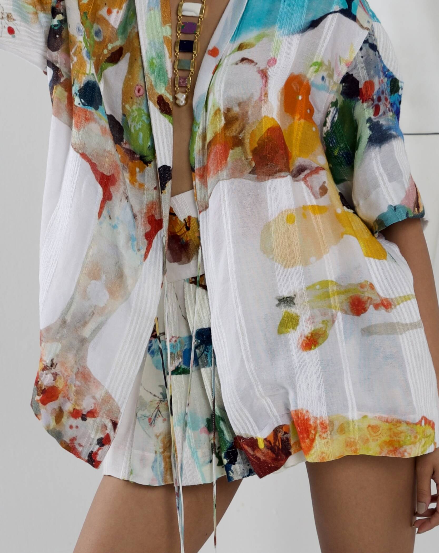 Time to flex IZEL Co-ord, with a knife-pleated mini skort featuring shorts underneath, made in flowy cotton gauze weave in a drop-dead gorgeous abstract print, a silhouette that rests at the waist and flows on the legs, lined with modal fabric and comes with a convenient side zip closure and, a relaxed shirt, made in a beautiful cotton gauze weave with a radiant abstract print. The front opening is decorated with drawstrings embellished with beaded pop-color tassels.