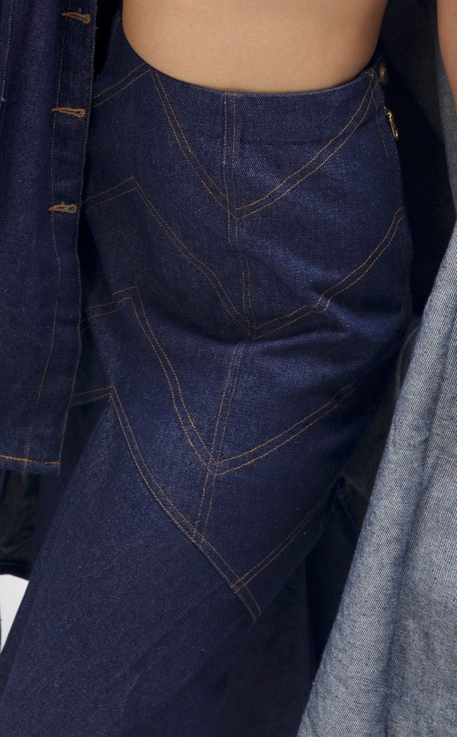 Sheesh, the fit and flare KEFI Asymmetric Skirt is a queen for your wardrobe as it is made in fabric denim, designed in the color indigo, and enhanced with the contrast double stitch on the waist to make your moves look immaculate. It Fastens with a side zipper, sinches your waist, and flows below the knees as smooth as water.
