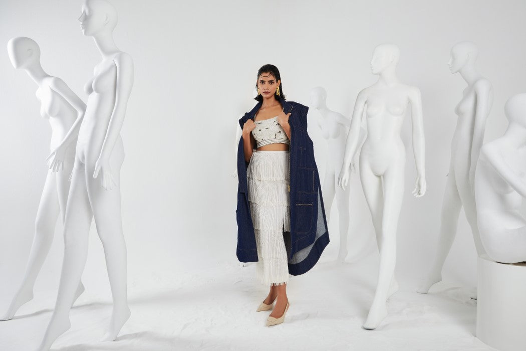 Our KEFI Fringe Skirt encourages you to go out into the world, with your held high, and find strength through your style, made in breathable/stretchable cotton lycra fabric, hugs your body with a zipper at the back, adorned with fringe lace all around alongwith a slit at the back. Pair it with KEFI Bustier and you're set to escape the ordinary.