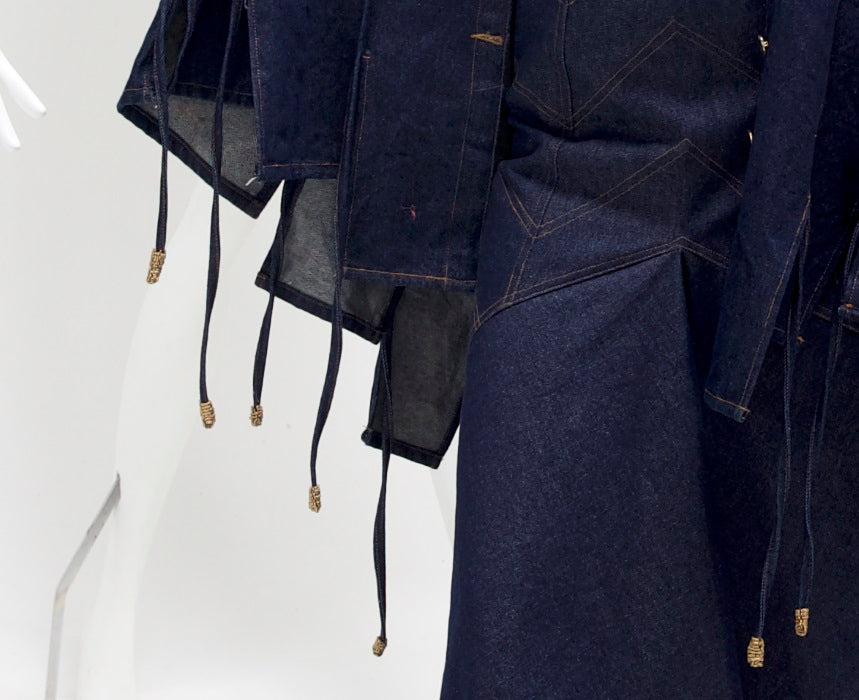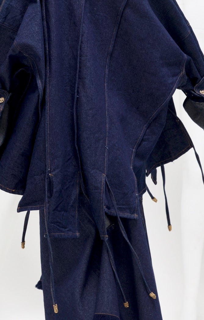 A must-have for your collection, this KEFI Oversized Shirt, is made in fabric denim in the color indigo, adorned with gold hammered buttons at the front with a shirt collar and dual opening at the sleeve cuff. The shirt is constructed in panels to give those curves a fine flow, extended with hanging drawstrings embellished with gold matte finish beads ends with an asymmetrical hemline.