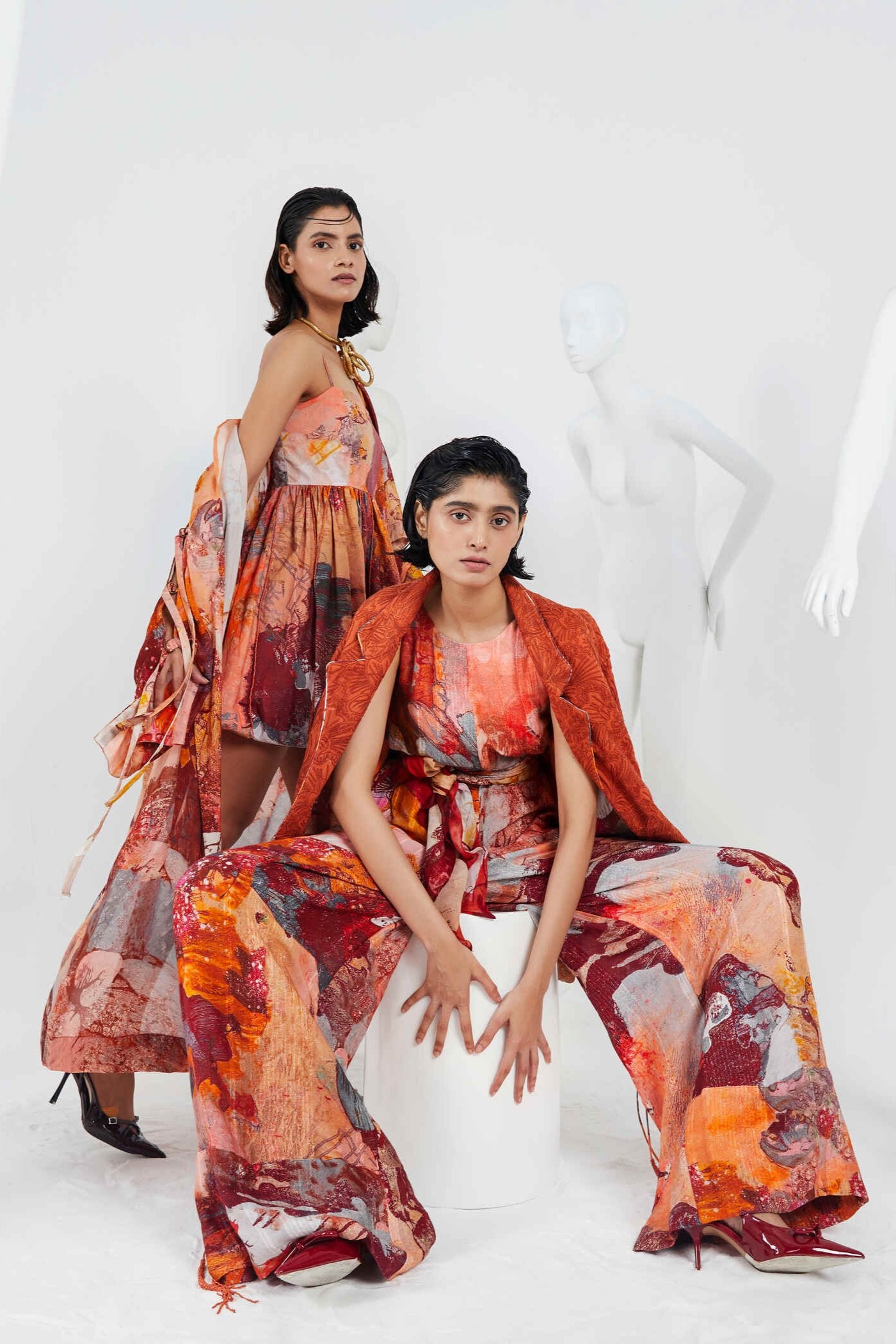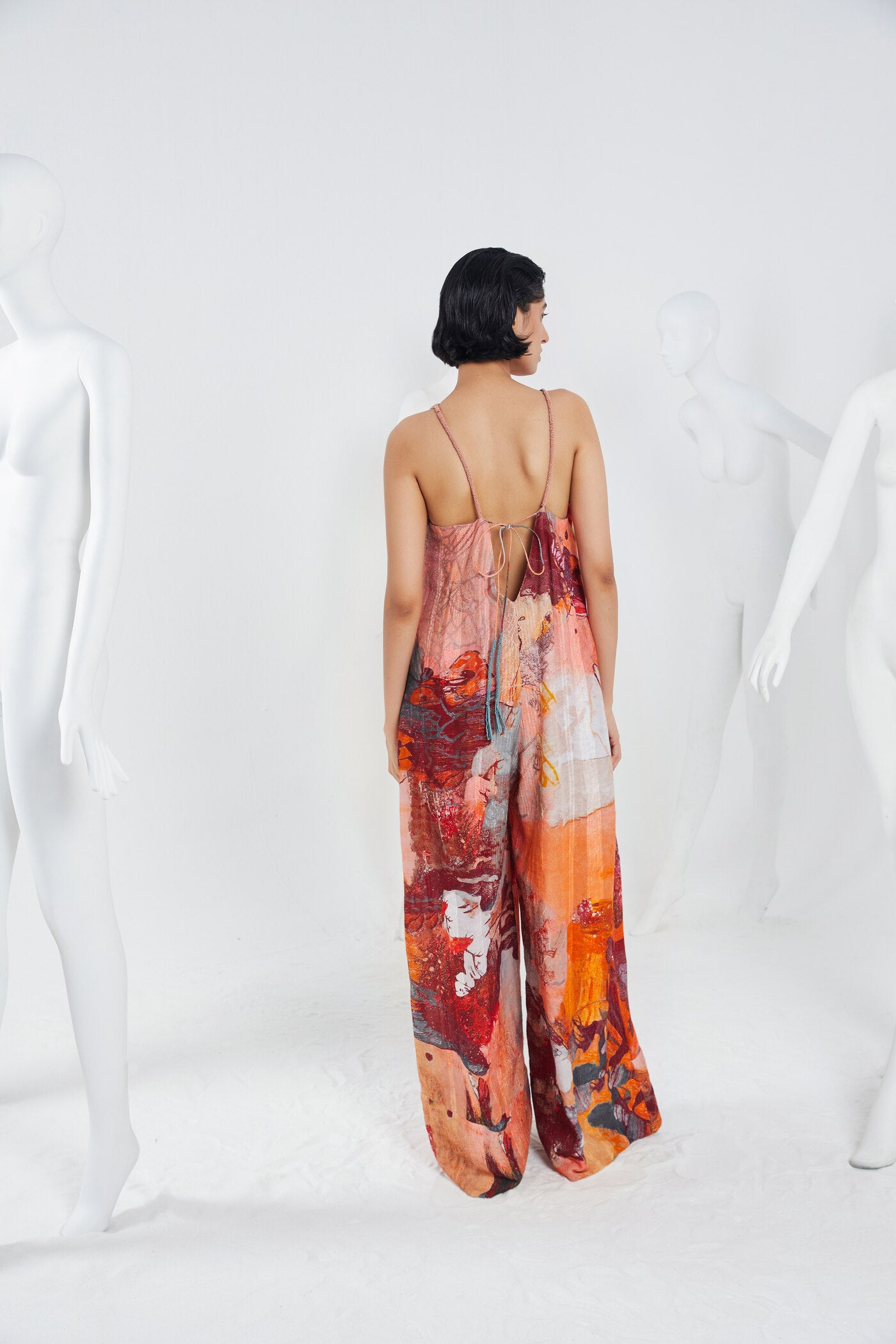 One is never underdressed or overdressed with this KOA Trapeze Jumpsuit crafted with cotton gauze striped in a cut jumpsuit in a print inspired by landscape scenes in terracotta earthy shades, having beautiful, embellished straps and a pair of beaded tassels at the back with deep V neckline, fastens with a zipper at back. Pair it with heels and it becomes apt for your brunch outfit.