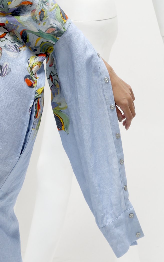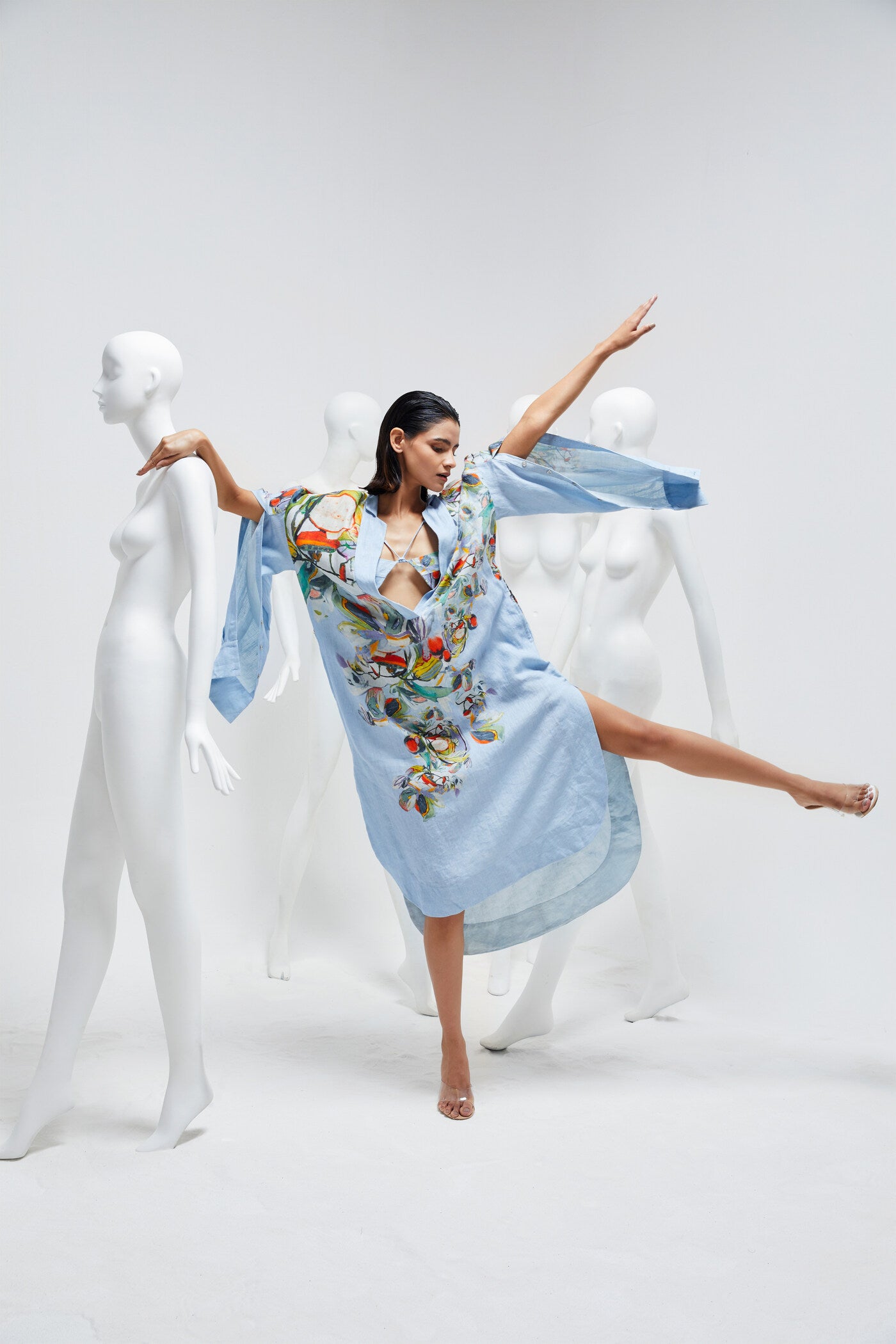 VIELLA Oversized Dress from the Prefall'24 exudes an effortless and timeless charm. Crafted from a luxurious linen-cotton blend that promises comfort and aspiration, the linen dress features a lapel neck, inseam pockets and full long sleeve with a high slit and buttons thereto. It is adorned with a playful abstract placement print, ends in an apple bottom hemline, a relaxed silhouette, a charming style apt for those special events.